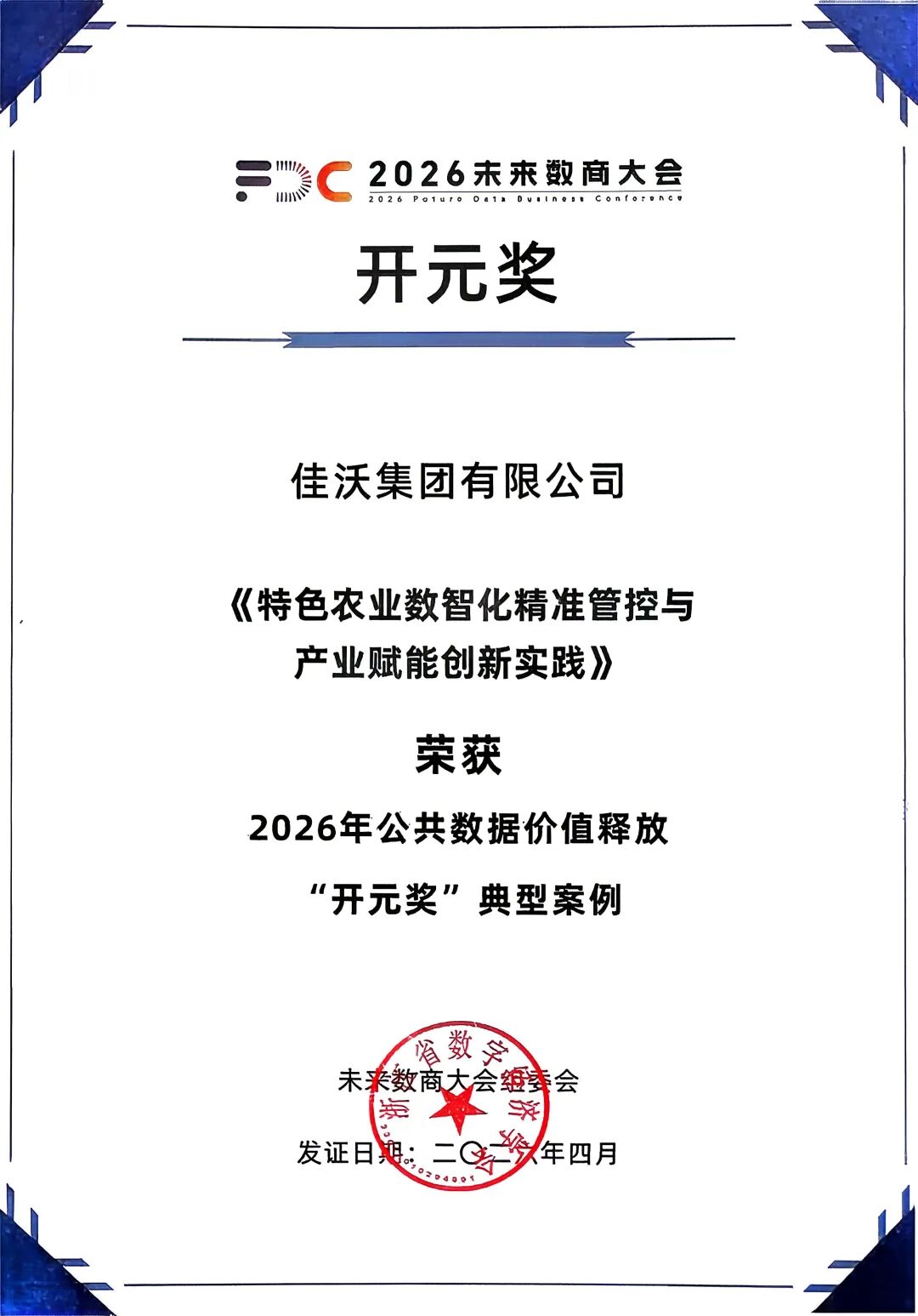 近日,以数据定义智能为主题的2026未来数商大会在杭州余杭未来科技城顺利举行。会上发布了第三届公共数据“开元奖”典型案例,佳沃集团凭借”特色农业数智化精准管控与产业赋能创新实践“成功入选。